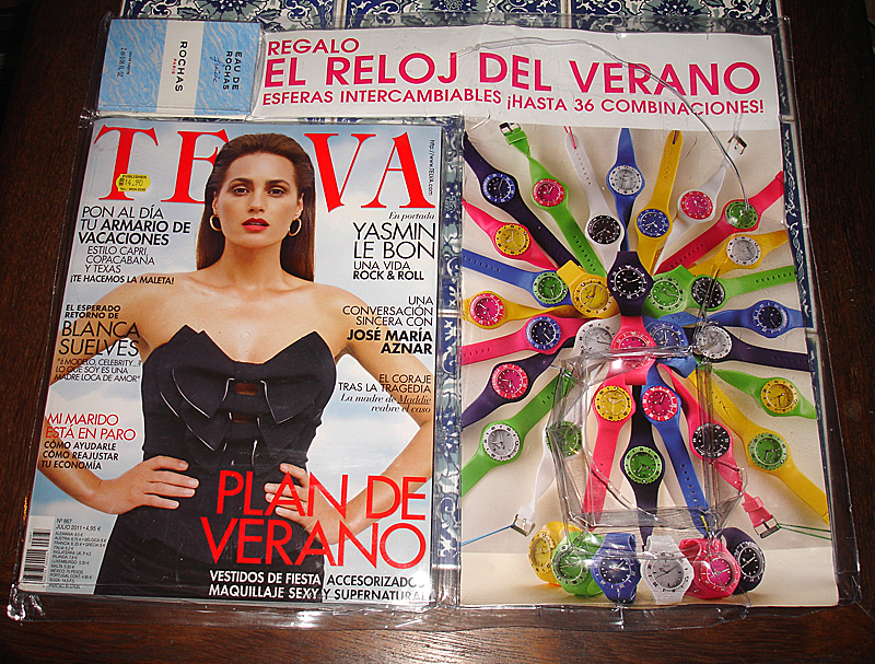 Eu gastei muito a sola da minha Havaina para encontrar o relógio perfeito! É que a revista mexicana Telva do mês de julho, que só chegou agora por aqui, traz um relógio como brinde, mas eu queria o azul-marinho-escuro pra cacete-quase negão. Acho que combina mais com qualquer roupa. Achei os outros que são muito coloridos e almodovarianos... E consegui depois de dias e mais dias rodando pelas bancas de jornais cariocas. O meu estava no jornaleiro na esquina das ruas São Salvador e Marquês de Abrantes, no Flamengo.